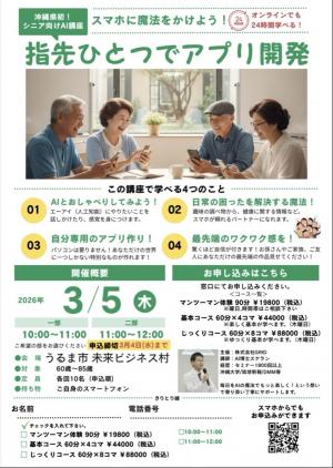 | セミナー名 | 沖縄県初!シニア向けAIスクール 指先ひとつでアプリ開発 24時間オンラインでも学べる!! |
